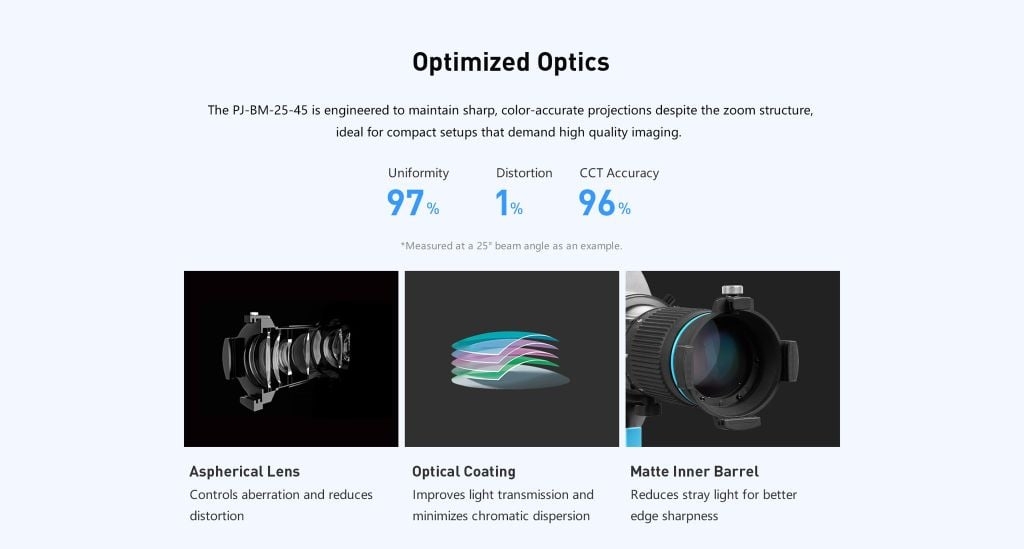 Thiết bị tích hợp khả năng zoom xoay, cải tiến so với phụ kiện chiếu sáng truyền thống, cho phép điều chỉnh góc chùm sáng liên tục từ 25° đến 45°, tối ưu hóa hiệu quả thiết lập ánh sáng. Thiết kế tinh giản, gọn nhẹ, lược bỏ gông, tăng cường tính di động và dễ dàng lắp đặt, phù hợp với các nhà sáng tạo độc lập, nhóm nhỏ và các tình huống đòi hỏi điều chỉnh ánh sáng linh hoạt.