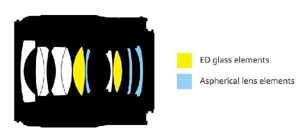 Hai thấu kính tán sắc cực thấp ED thực hiện chức năng giảm hiện tượng quang sai màu và viền màu, cải thiện độ tương phản về màu sắc để hình ảnh hiển thị trung thực và sống động hơn. Ba thấu kính phi cầu có tác dụng giảm cầu sai, méo hình, giúp hình ảnh chụp được chính xác nhất, sắc nét nhất và không bị sai lệch về hình dạng.