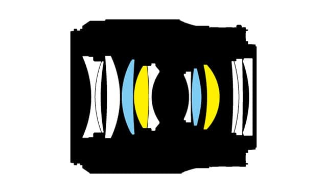 Ống kính có cấu tạo quang học gồm 12 thấu kính được chia thành 9 nhóm, trong đó có hai thấu kính phi cầu và hai thấu kính ED có chức năng quan trọng trong cải thiện chất lượng hình ảnh.
