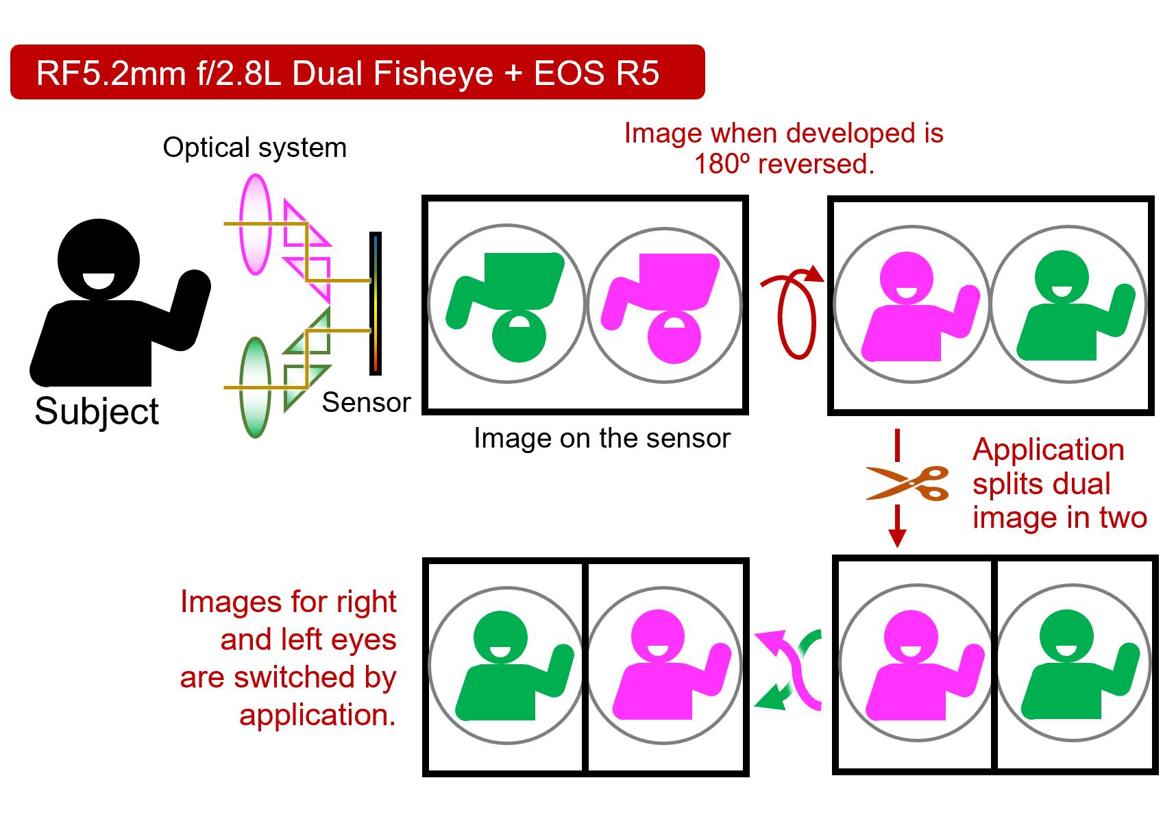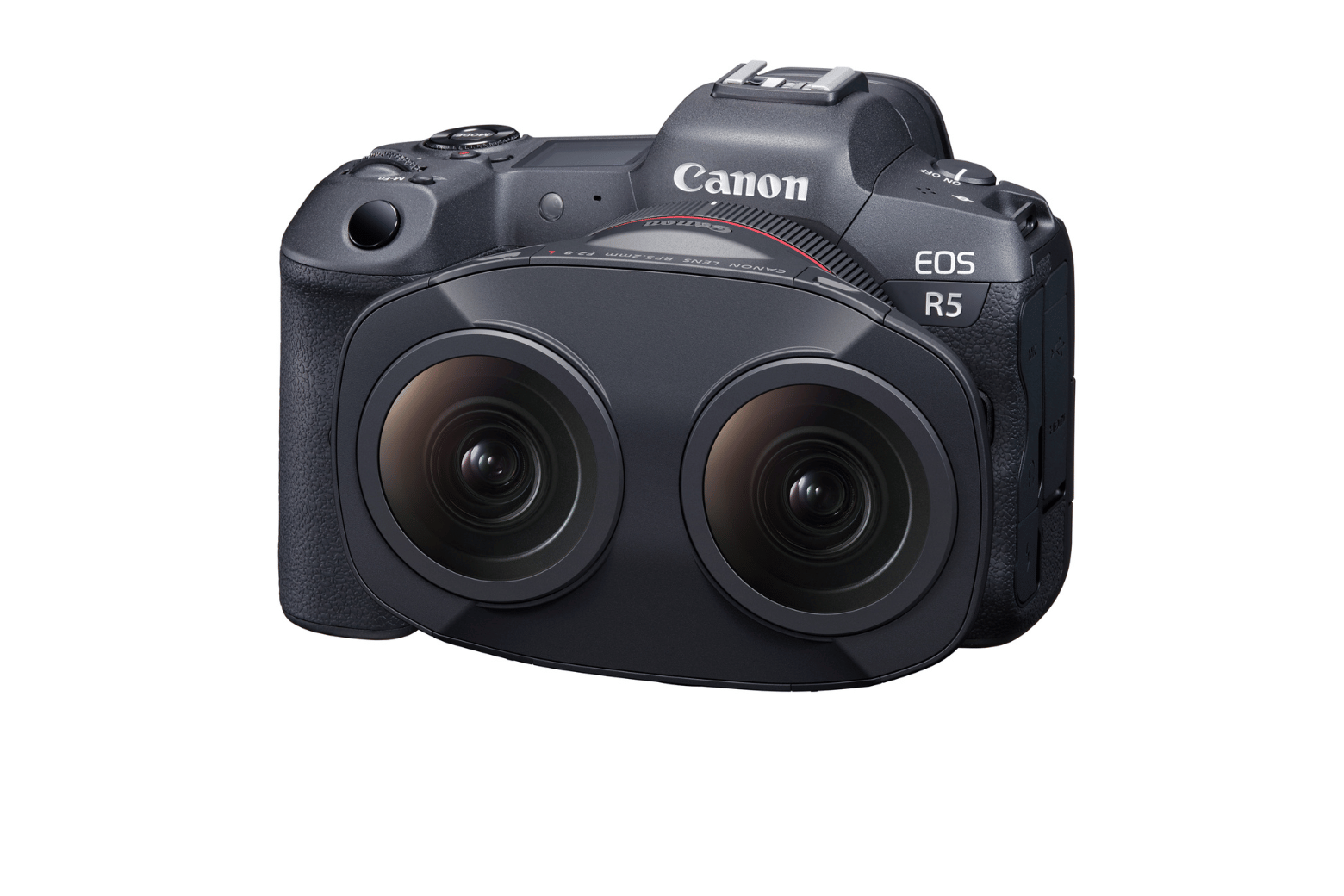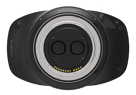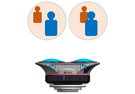 Ống mắt cá đôi RF5.2mm f / 2.8L ghi lại hình ảnh lập thể 180 độ 3 chiều (3D). Bằng cách sử dụng thị sai của ống kính mắt cá trái và phải. Thiết kế này cho phép một cảm biến duy nhất nhận ánh sáng từ cả hai ống kính. Đơn giản hóa việc quay video Thực tế ảo (VR) thông qua một camera duy nhất.