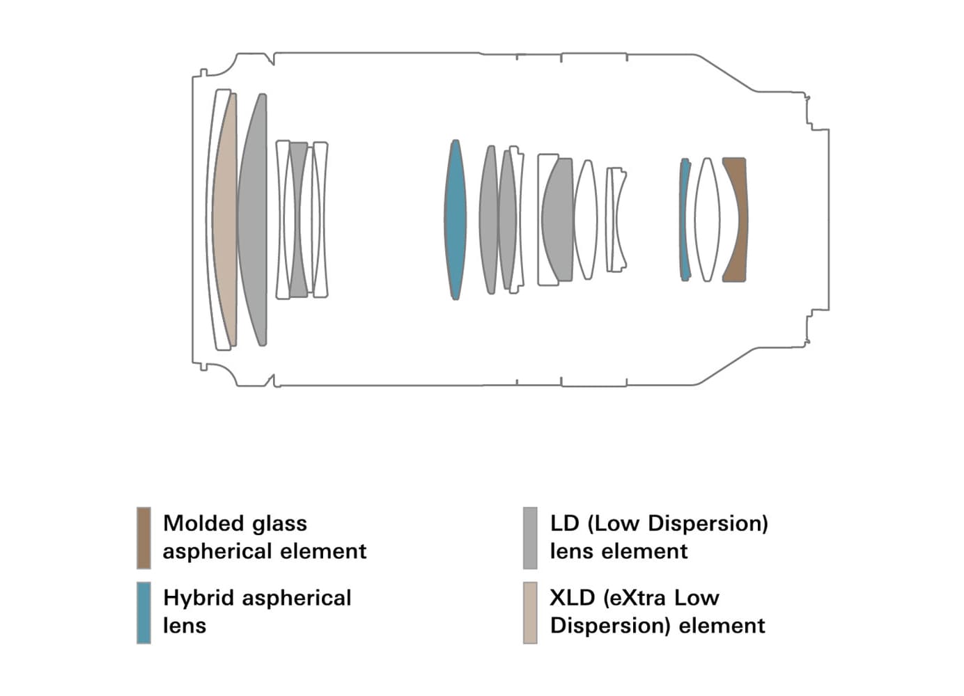 Ống kính có cấu tạo bao gồm 6 thấu kính phân tán thấp bao gồm cả XLD và LD giúp giảm đáng kể viền màu và quang sai màu toàn bộ phạm vi zoom để cải thiện độ rõ nét và độ chính xác của màu sắc. Bên cạnh đó, ba thấu kính phi cầu cũng được sử dụng giúp giảm quang sai hình cầu và biến dạng để có độ sắc nét cao và kết xuất chính xác trong toàn bộ phạm vi thu phóng. Với khẩu độ tối đa f/2.8 không đổi, chiếc ống kính mirrorless này mang lại độ sáng nhất quán trong toàn bộ phạm vi zoom, cải thiện khả năng kiểm soát độ sâu trường ảnh.
