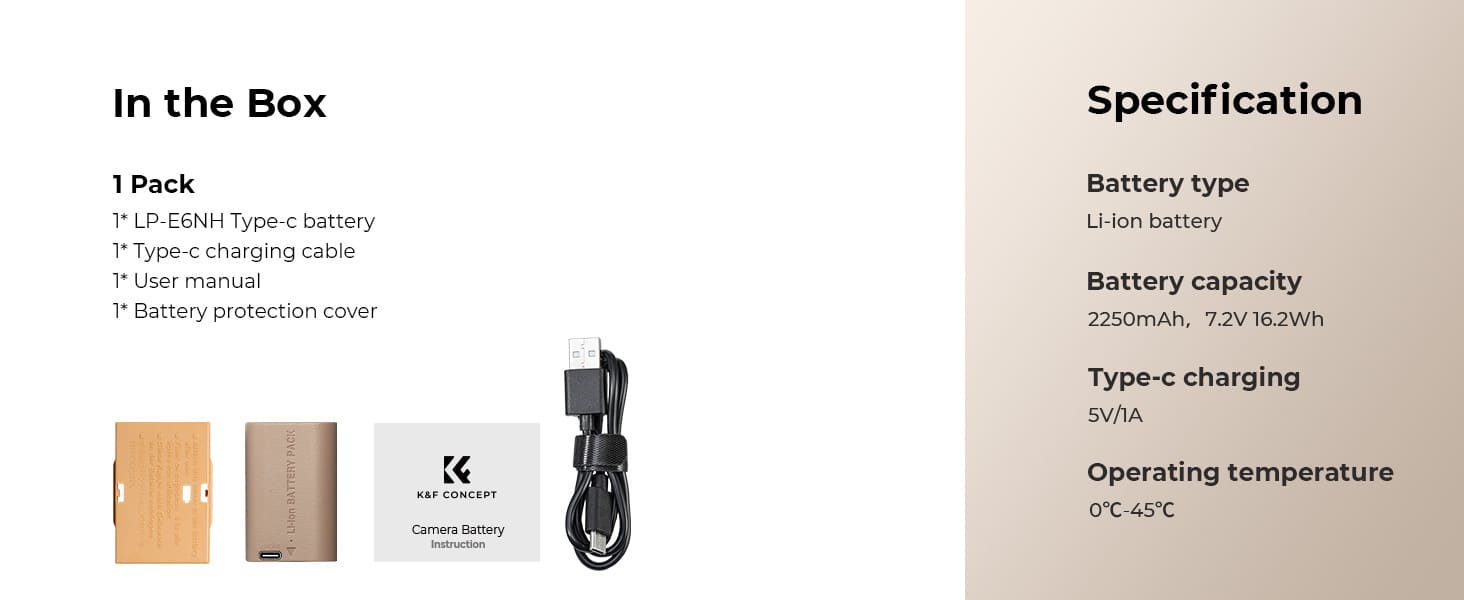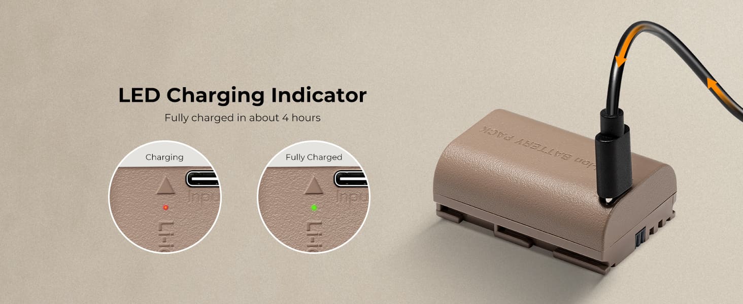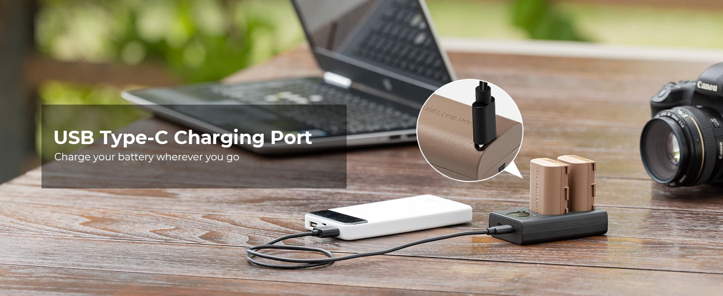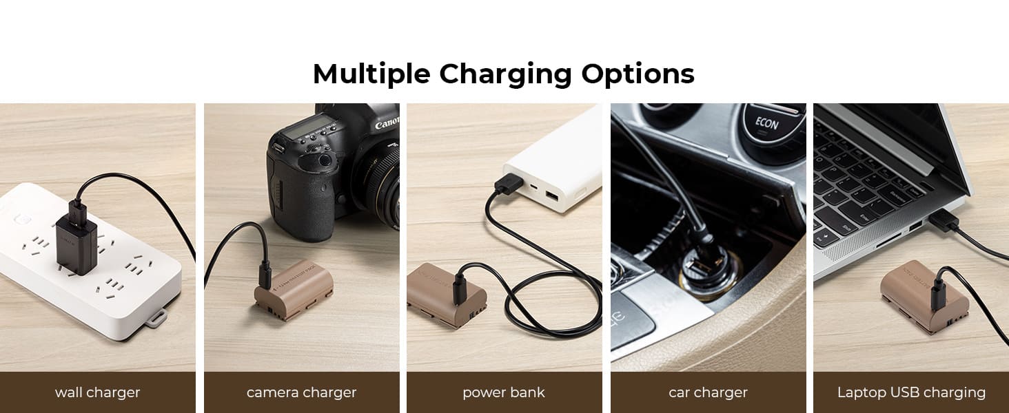 Nó có thể được sạc trực tiếp bằng cáp sạc Loại C và cũng tương thích với bộ sạc chuyên dụng LP-E6; sạc qua bộ sạc tường USB, bộ sạc xe hơi hoặc nguồn điện di động bên ngoài, mang đến nhiều sự lựa chọn hơn cho việc sạc pin.