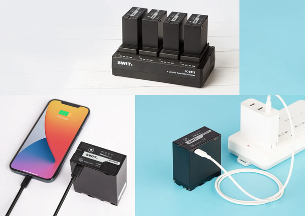Để sạc nhanh và hiệu quả nhất, bạn có thể sử dụng bộ sạc 4 chiều SWIT LC-D421 để sạc đồng thời nhiều pin NP-F.