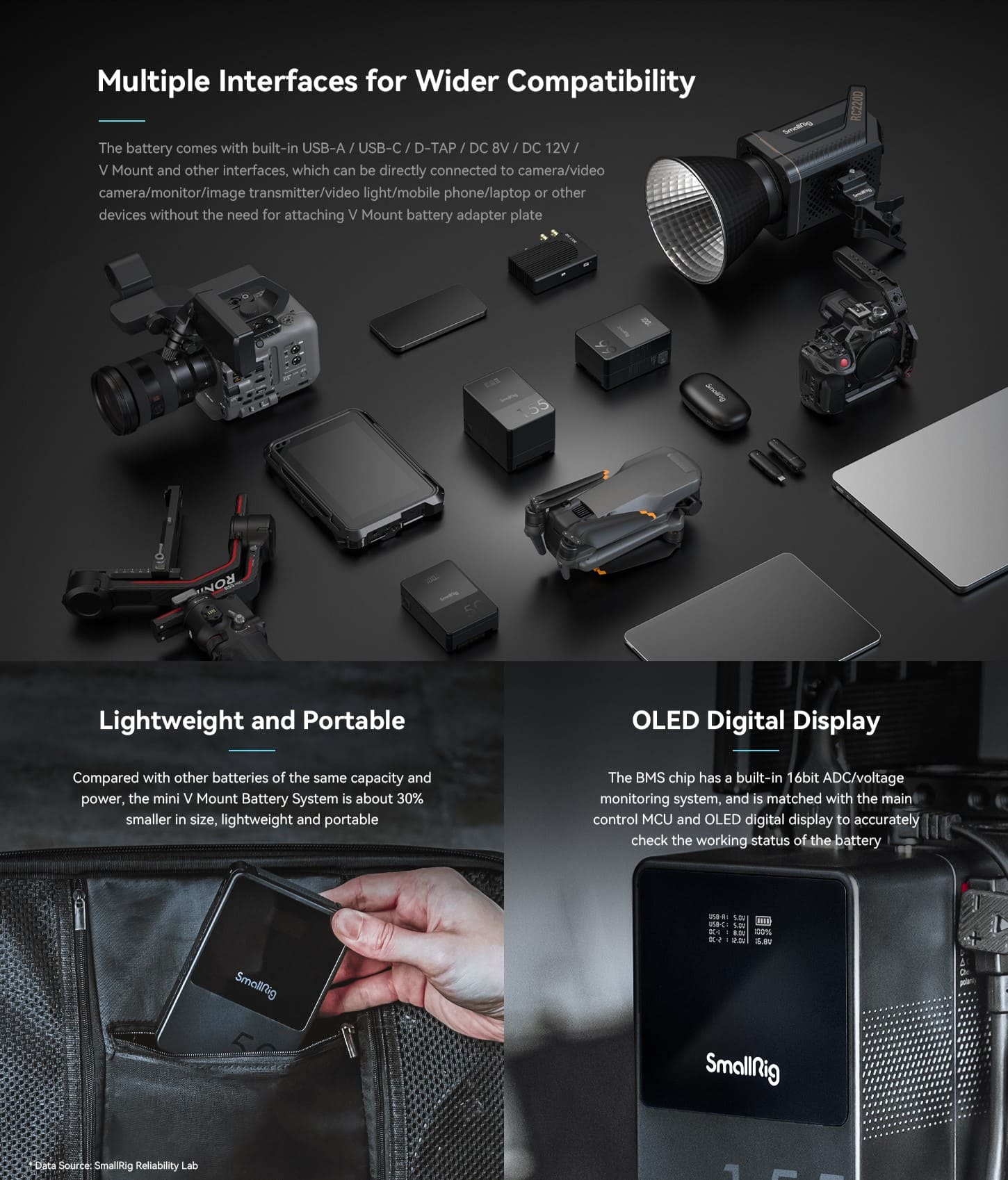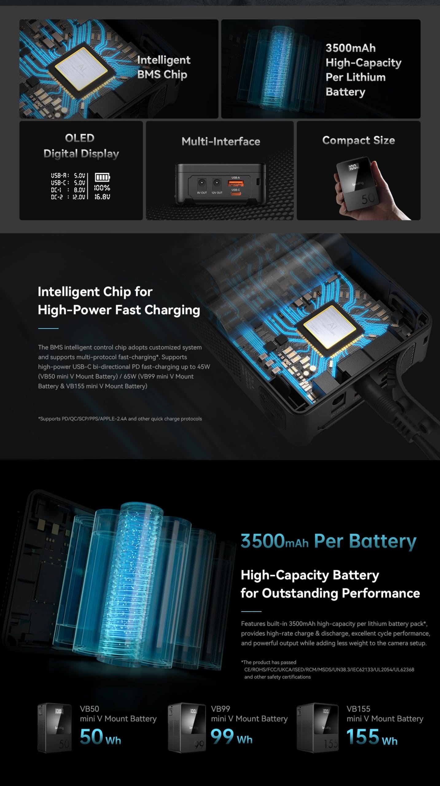 VB155 có kích thước bằng 70% so với pin V-mount thông thường, nhờ thiết kế tích hợp cao, chiếm ít không gian hơn, làm cho nó nhẹ hơn và di động hơn! Chip BMS tích hợp cao (chip giao thức sạc nhanh + MCU + điều khiển tăng điện áp) hỗ trợ một loạt các giao thức sạc nhanh chủ đạo (PD / QC / SCP / PPS / APPLE-2.4A, v.v.), hai chiều 65W (Tối đa) Sạc nhanh USB-C PD, cũng như tăng điện áp thích ứng / điều chỉnh dòng điện thích ứng, v.v.! Ngoài ra, hệ thống BMS thông minh tùy chỉnh của nó đảm bảo sạc nhanh hơn và an toàn hơn bằng cách cung cấp nhiều biện pháp bảo vệ chống lại quá dòng / ngắn mạch / quá nhiệt / quá áp, v.v. Các giao diện như USB-A / USB-C / D-tap / DC 8V / DC 12V / V Mountare cũng được bao gồm để sạc / cấp nguồn hiệu quả cho máy ảnh / máy quay / màn hình / máy phát video không dây / đèn video / điện thoại di động / máy tính xách tay, v.v. mà không cần sử dụng tấm V-mount để chuyển đổi! Chip BMS có thuật toán ADC / đồng hồ đo công suất 16bit, cùng với MCU và màn hình kỹ thuật số OLED để bạn luôn theo dõi trạng thái của pin. Pin hiệu suất cao cao cấp tích hợp (không tăng dung lượng), có thể sạc lại và ổn định, đáp ứng MSDS / UN38.3 / IEC62133 / UL2054 / UL62368 và các tiêu chuẩn quốc tế được công nhận khác, cho phép bạn ghi lại mọi khoảnh khắc mà không phải lo lắng!