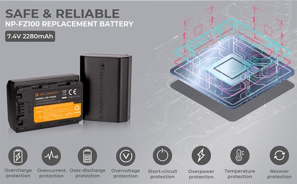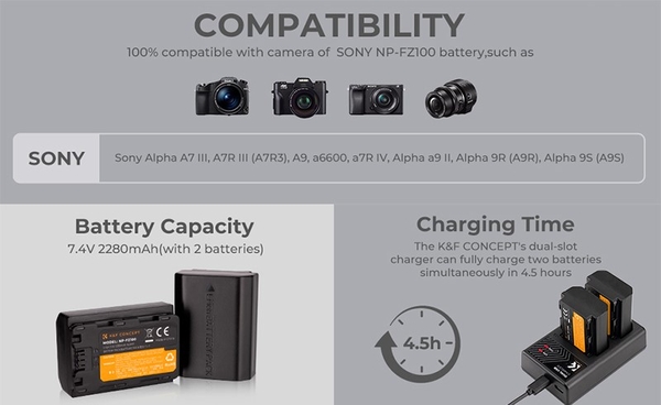 | Máy ảnh Sony tương thích | A7IV, A7III, A7C, A7R III, A7R IV, A7Siii, A7Cii, A6700, A6600, Alpha 9, A9II, A9R, A9S, A1, ZV-E1, ZV-E10II, FX3, FX30 và các máy ảnh Sony khác sử dụng pin NP-FZ100 |