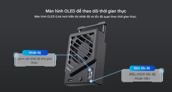 Màn hình hiển thị trên Quạt Tản Nhiệt Ulanzi CA25 chứa đựng các thông số quan trọng như nhiệt độ camera và tốc độ quạt. Điều này giúp người dùng dễ dàng kiểm soát và điều chỉnh để đảm bảo máy ảnh luôn hoạt động ổn định trong quá trình sử dụng.