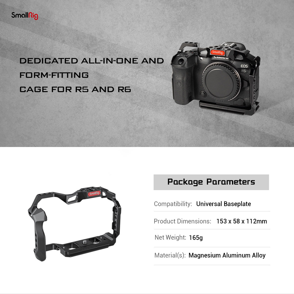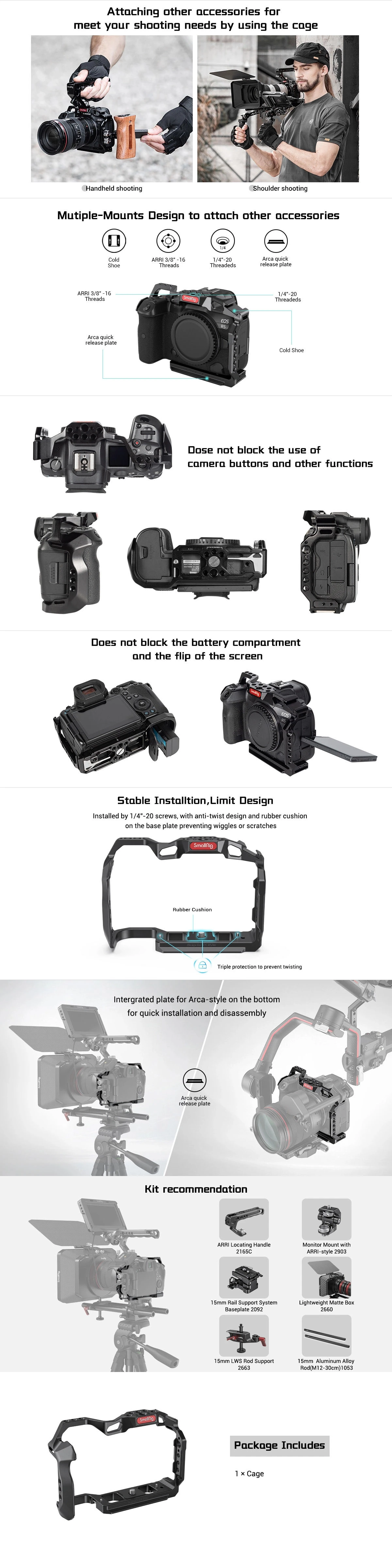 SmallRig Full Camera Cage cho R5 & R6 & R5 C 2982B cung cấp khả năng bảo vệ cho máy ảnh và nhiều điểm lắp phụ kiện để thực hiện công việc quay phim thuận tiện. Nó được cố định vào máy ảnh thông qua một vít 1/4"-20 và hai chốt định vị, có đệm silicon ở mặt trên và mặt dưới để tránh trầy xước. Lồng có nhiều ren 1/4"-20 và 3/8"-16 các lỗ để gắn các phụ kiện như Tay cầm bên 2093, Tay cầm trên cùng 1984 và Tay cầm có đầu bi 2070. Phía bên trái của nó hỗ trợ Kẹp cáp 2981; mặt trên của nó có đế gắn micro và đèn LED. các lỗ định vị ở phía trên, bên trái và bên phải phù hợp với Tay cầm trên ARRI 2165, Tay cầm bên ARRI HSS2426 & 2914. Các lỗ ở cả hai bên và phía dưới của bộ đồ Dây đeo tay PAC2456, Dây đeo cổ tay PSW2398 và Dây đeo vai PSC2428. Cờ lê tích hợp giúp tháo các vít ở phía dưới và có thể trượt ra từ bên cạnh mà không cản trở việc gắn tấm tháo nhanh. Cạnh phải được thiết kế vừa vặn với tay cầm máy ảnh cho cảm giác cầm nắm nguyên bản và thoải mái. Ngoài ra, tấm tháo nhanh kiểu Arca dưới đáy lồng và các lỗ ren 1/4"-20 cho phép kết nối tấm tháo nhanh kiểu Arca DJI RS2/RSC2 ban đầu, có thể được gắn vào tấm tháo nhanh DJI RS2/RSC2 Manfrotto rồi đặt lên chất ổn định.