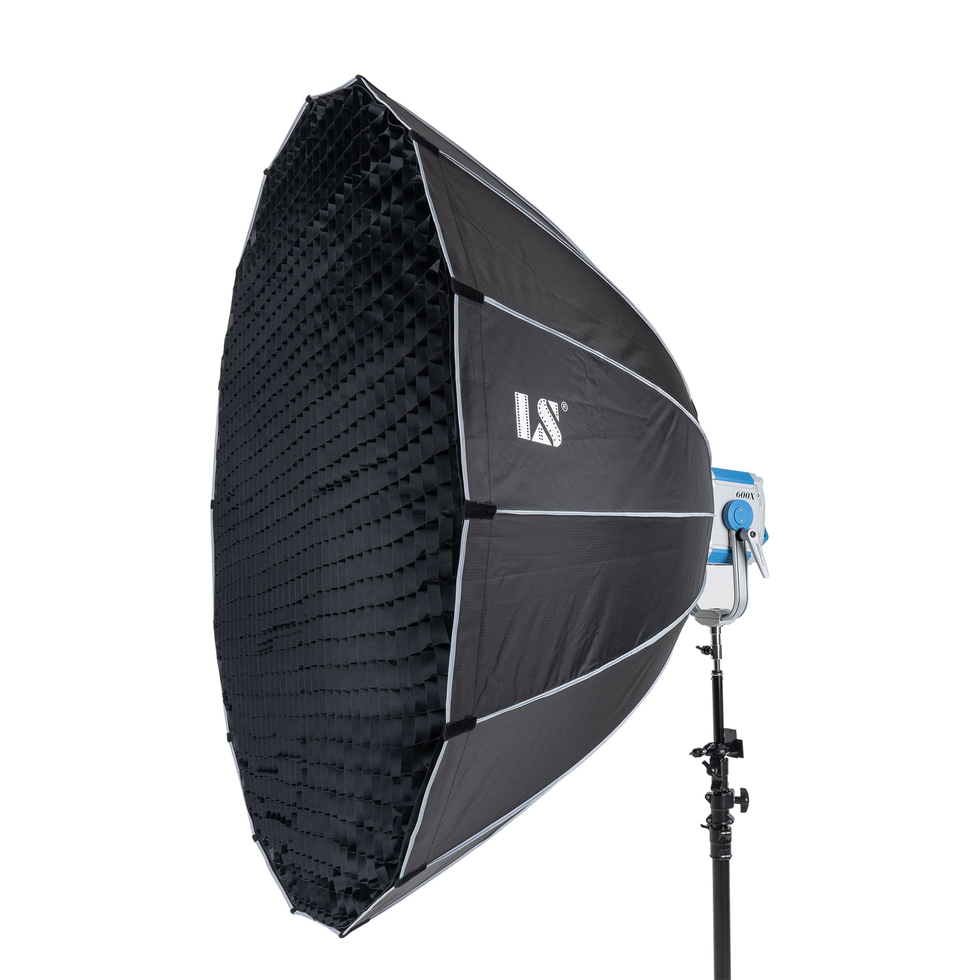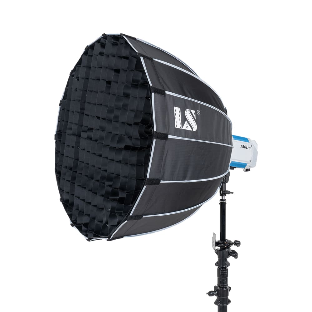 Softbox Deep Parabolic thao tác nhanh với giá đỡ Bowens, mặt bên trong phủ lớp phản chiếu màu bạc và 2 lớp bộ khuếch tán cho ánh sáng LED mềm mại