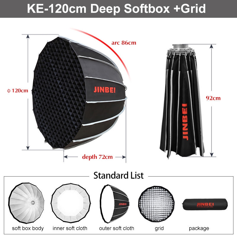 JINBEI KE - Softbox Parabol Sâu 120cm, Gắn Bowen, Gọn Nhẹ Cho Studio