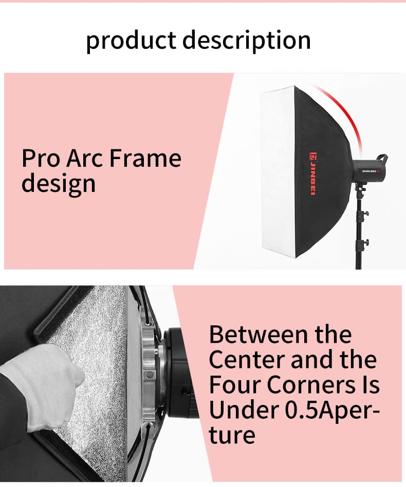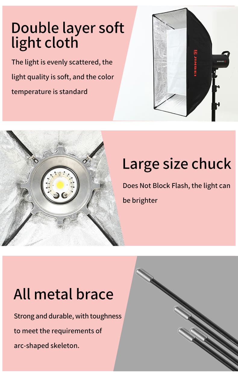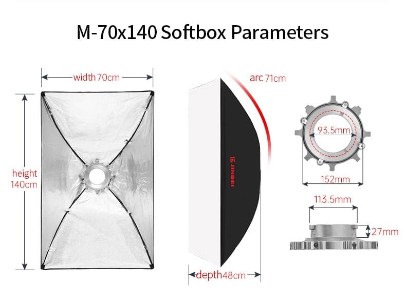 Jinbei M70x100 được cấu tạo bằng chất liệu vải kết hợp với thanh kim loại để tạo thành . Tác dụng của softbox là gom sáng và làm mềm ánh khi chiếu tới chủ thể . Jinbei M70x100 có kích thước là 70x100cm. Sản phẩm phù hợp với đèn led và đèn flash sử dụng ngàm bowen