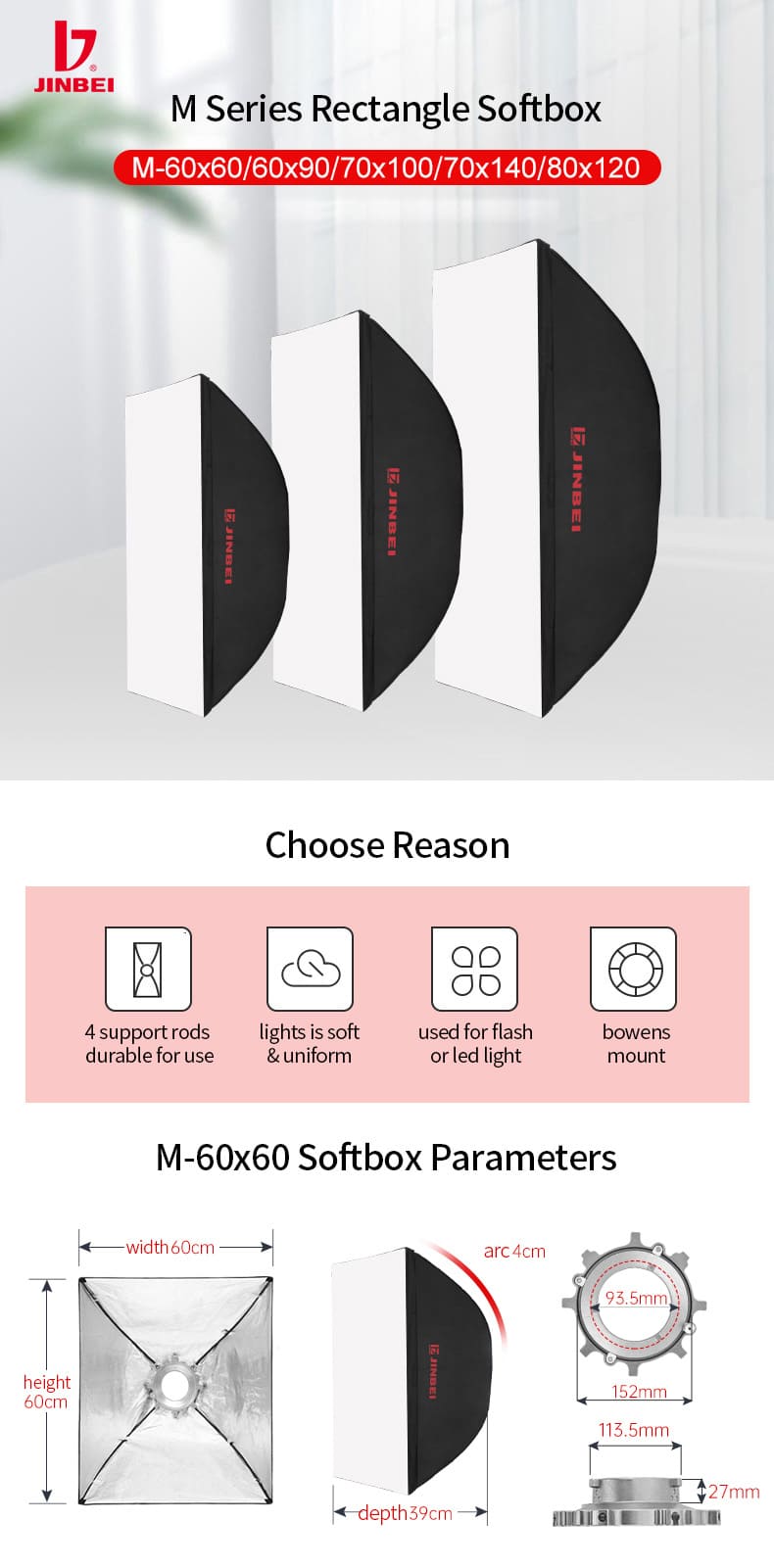 Jinbei M70x140 được cấu tạo bằng chất liệu vải kết hợp với thanh kim loại để tạo thành . Tác dụng của softbox là gom sáng và làm mềm ánh khi chiếu tới chủ thể . Jinbei M70x140có kích thước là 70x140cm. Sản phẩm phù hợp với đèn led và đèn flash sử dụng ngàm bowen