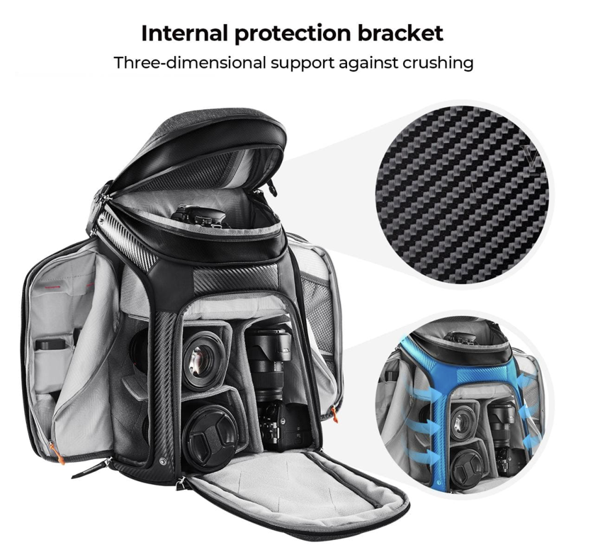 Ngăn chứa thông minh: Phân chia hợp lý với nhiều ngăn đựng máy ảnh, ống kính, laptop và phụ kiện. Một số mẫu còn có ngăn riêng cho tripod.