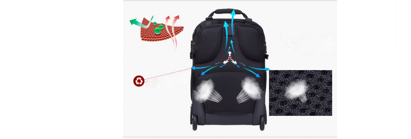 Mặt sau vali được thiết kế lỗ nhỏ thông hơi , giúp người dùng dù đeo lâu cũng cảm thấy thoáng mát , không ra mồ hôi lưng . Nếu không muốn thành vali có thể lấy dây ra đeo thành balo .